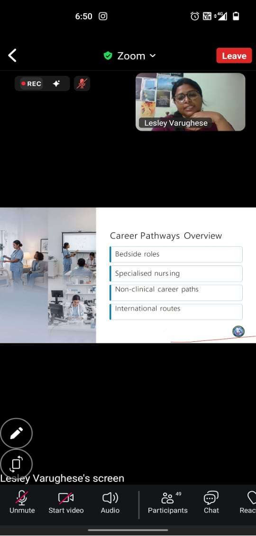 The session started at 6:00 pm, and the event's speaker, Ms Helma Maria Monterio, was introduced by Mr Popson Antony, along with Ms Leslay Rachel Vargughese from MEDCITY INTERNATIONAL ACADEMY. They explained about the MEDCITY INTERNATIONAL ACADEMY and their coaching. The session aims to equip students with a comprehensive understanding of global nursing career opportunities. Nursing is a highly regarded profession worldwide, and there is a significant shortage of nurses, particularly in countries like the United States, the United Kingdom, Australia, Canada, and various Middle Eastern nations, where Indian nurses are in high demand due to their strong clinical skills, English proficiency, and adaptability. Each country has its own set of requirements and benefits for instance, the USA requires passing the NCLEX-RN and offers high salaries and advanced practice roles, while the UK provides NHS sponsorship and free adaptation training. Australia and Canada have their respective licensing authorities and exams, with Canada offering excellent migration options despite a longer process. The Middle East is attractive for its tax-free salaries and quicker placements. Additionally, specialized nursing roles such as ICU, emergency, and pediatric nursing are in high demand globally. To succeed, aspiring global nurses should focus on essential skills like clinical competence, effective communication, cultural sensitivity, and a commitment to continuous learning. Planning a global nursing career involves completing nursing qualifications, gaining clinical experience, preparing for language proficiency tests, passing licensure exams, and securing visas and employer sponsorships. However, challenges such as exam anxiety, financial constraints, and cultural adjustments can be managed through proper coaching, financial planning, and orientation programs. By the end of the class, participants will grasp the eligibility criteria for working internationally, familiarize themselves with popular destinations, necessary exams, and visa processes, and outline actionable steps to embark on an international nursing journey.