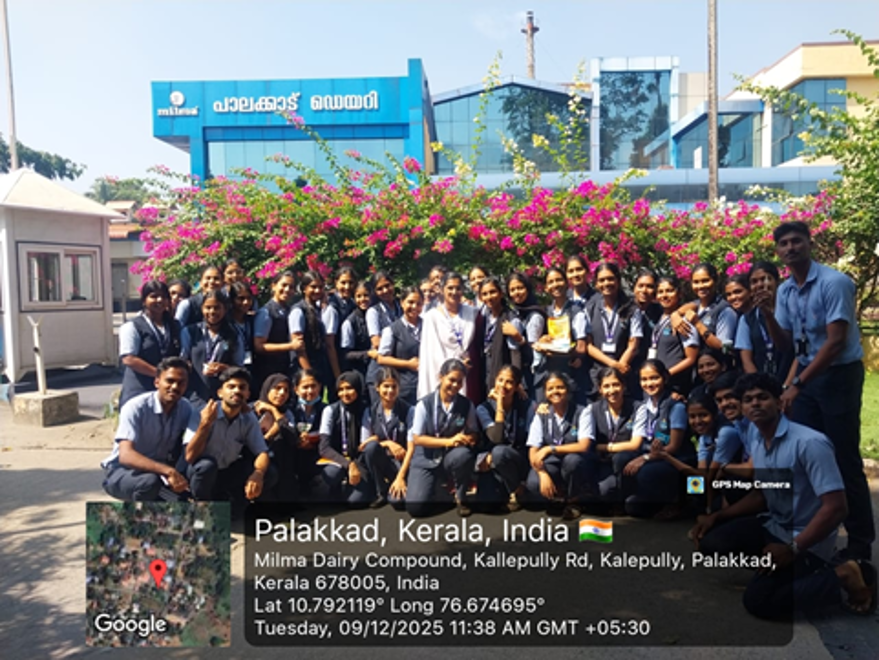 The visit offered students practical exposure to large-scale milk processing and quality control systems. Established in 1925 as a milk chilling centre, the Palakkad dairy has now grown into a major processing unit with a capacity of over 14 lakh litres of milk per day. Students observed the production processes of milk and value-added products such as ghee, curd, and sambaram, along with an overview of packaging, storage, and distribution practices followed at the plant.