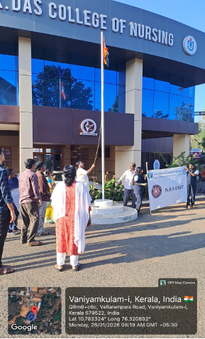 The NSS Unit of P.K. Das College of Nursing celebrated the 77th Republic Day with great pride and patriotism on the college campus. The program began with a welcome address by NSS Volunteer Ms. Farzana, followed by the flag hoisting ceremony led by the Principal, Prof. Dr. A. Priya Mary Stella.